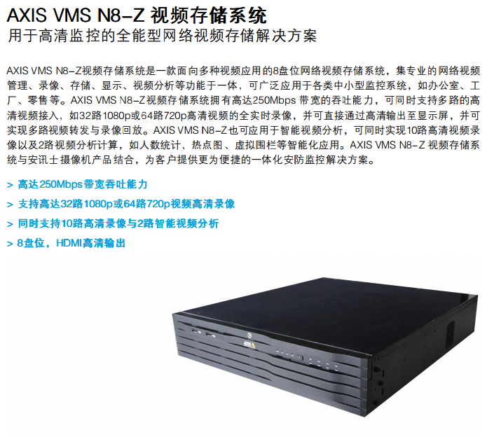 產(chǎn)品簡介:安訊士AXIS VMS N8-Z 視頻存儲系統(tǒng) 用于高清監(jiān)控的全能型網(wǎng)絡(luò)視頻存儲解決方案